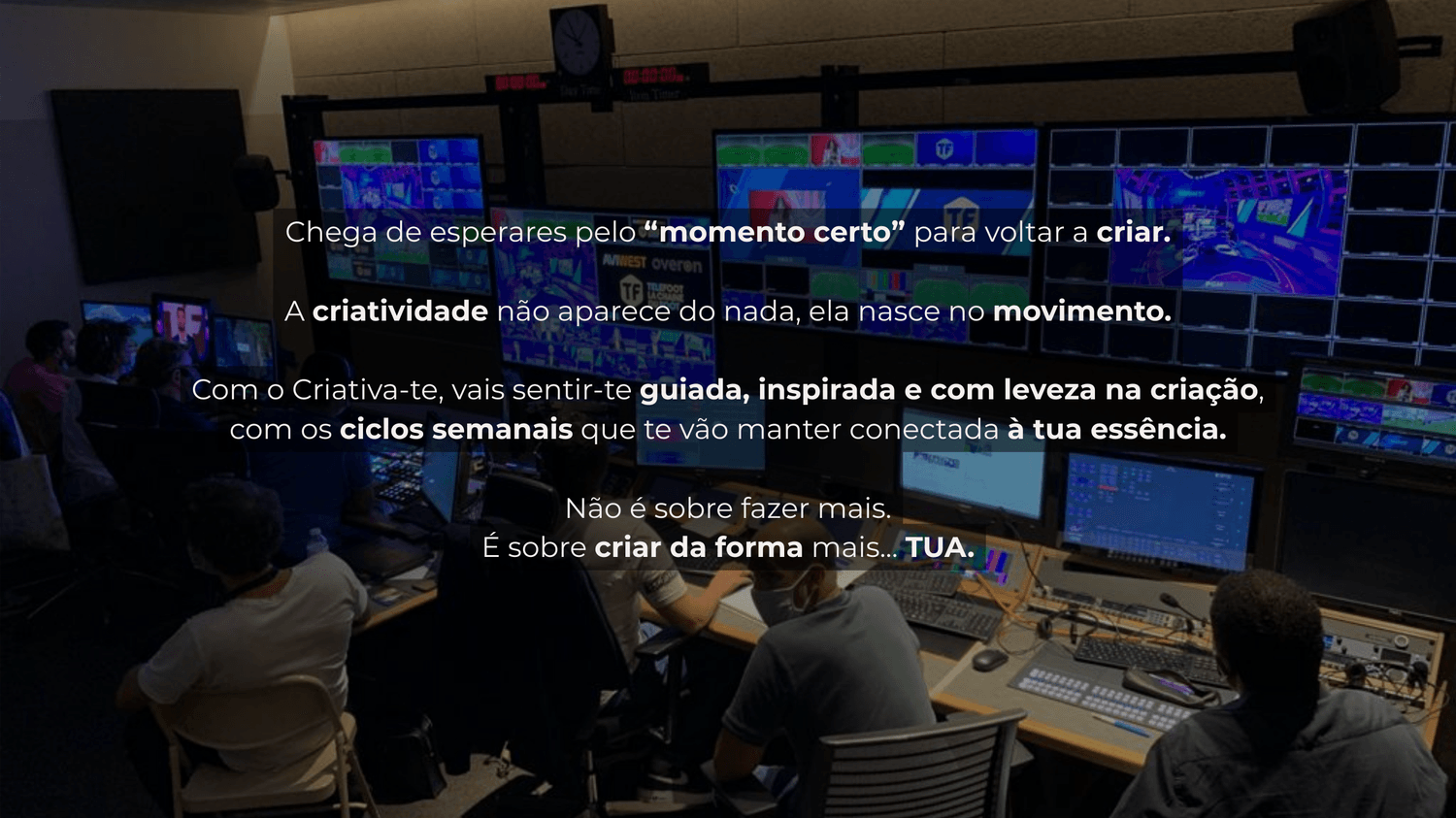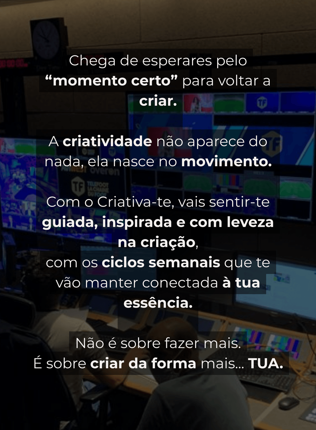 Já o Criativa-te é uma rotina leve e semanal, que te mantém em movimento criativo e faz com que continues a criar com leveza e consistência.
